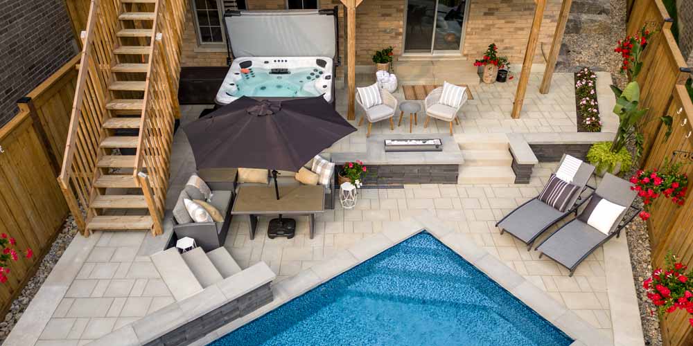 For the backyard, their vision (mainly) included a custom inground swimming pool, hot tub and interlock patio design & installation.