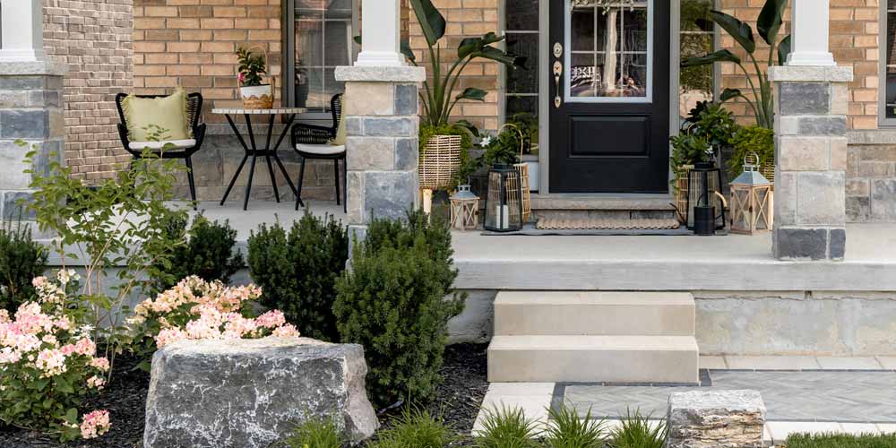 For the front of the house, they wanted a custom interlocking stone walkway, with stone steps at the porch and a landscaped garden.