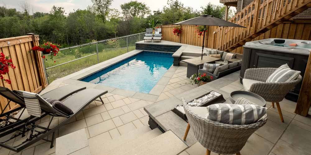 By adding a custom rectangle inground pool, intricate retaining wall, backyard interlock patio, stone steps and a hot tub installation, we ultimately transformed the backyard into a welcoming and luxurious oasis.