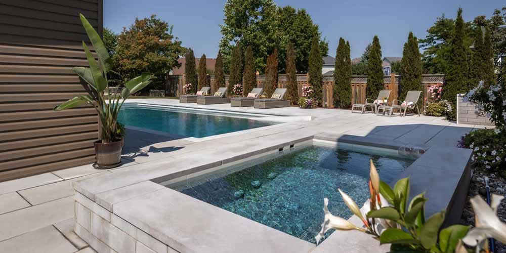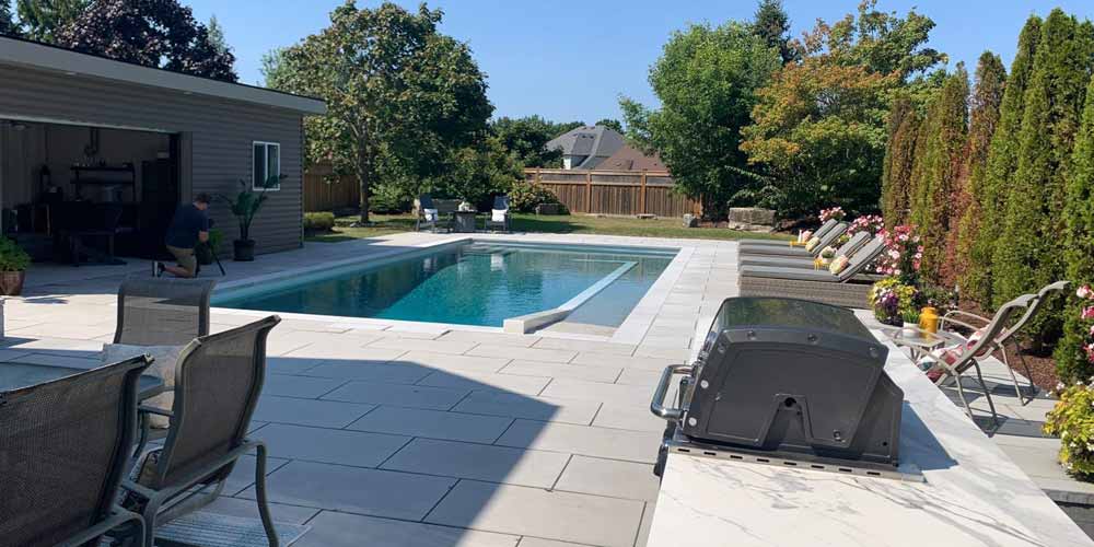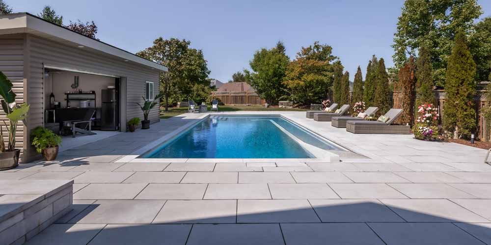 Inground Pool with Cabana & interlock patio landscaping installation in Whitby, Ontario