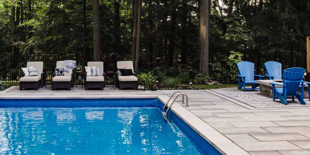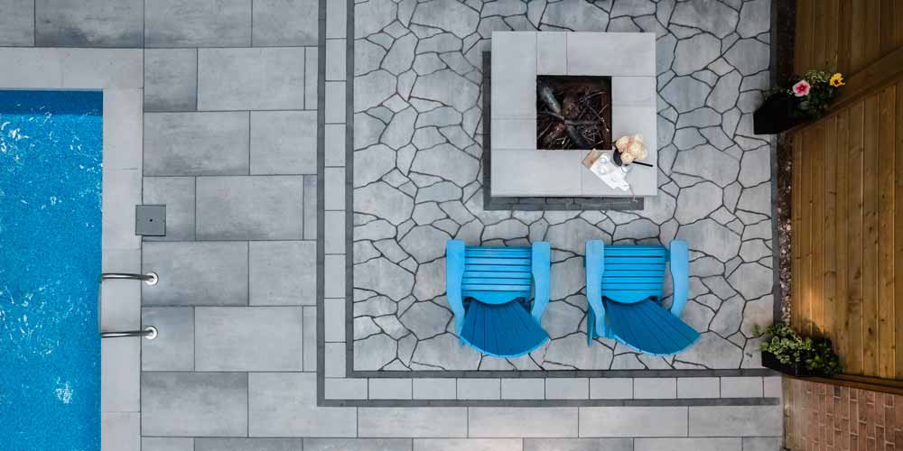 Two additional patterned stone patios were created to provide an area to lounge by the pool and for the fire feature area; the contrast in patterns and styles compliment the main interlock patio and result in a more upscale and elegant look and feel.
