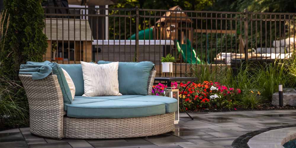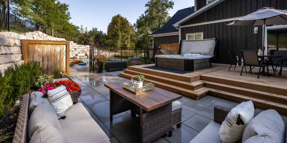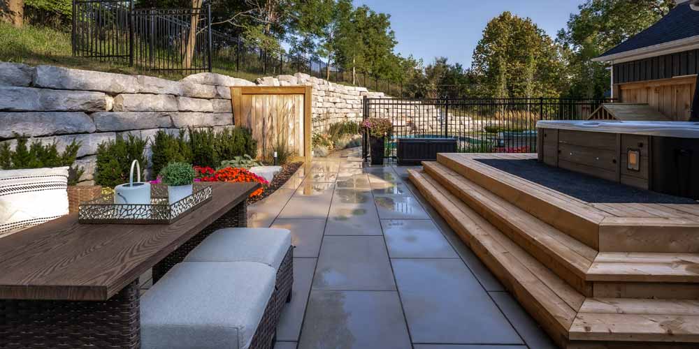 The patio space offers ample room for outdoor gatherings, adorned with a custom fence that adds both privacy and style and the custom stone steps add functionality and natural aesthetics to the space as well.