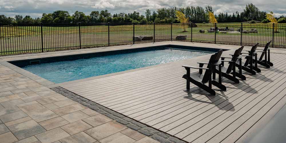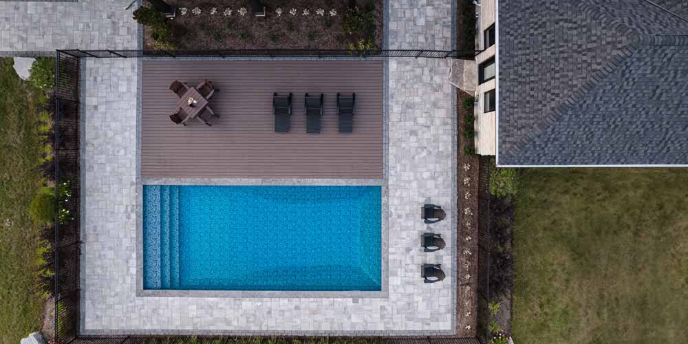 Included in this project was a large composite deck, or tanning area, just off the pool, along with a connection for a change area located in the detached garage.