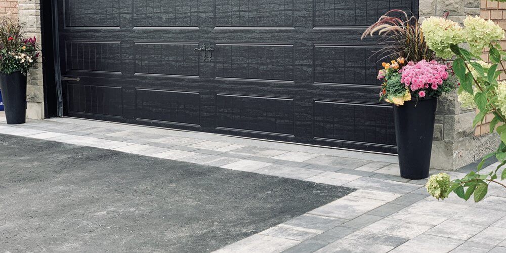 We enclosed their asphalt driveway with Beacon Hill Granite Fusion interlock pavers, with an accent paver through the middle.